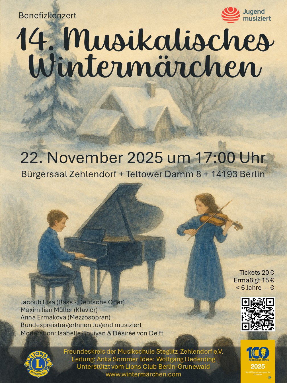 Das Benefizkonzert "Musikalisches Wintermärchen" wird vom Verein „Freundeskreis der Musikschule Berlin Steglitz-Zehlendorf" mit Unterstützung des "Lions Club Berlin-Grunewald" organisiert. Die Organisatoren freuen sich auf ihr zahlreiches Erscheinen.